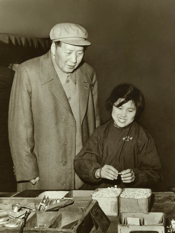 圖為:1958年2月13日,毛澤東主席視察二一三公司。 天水二一三員工蘇玉春(健在)一邊裝配產(chǎn)品一邊激動地回答毛澤東主席親切的詢問。
