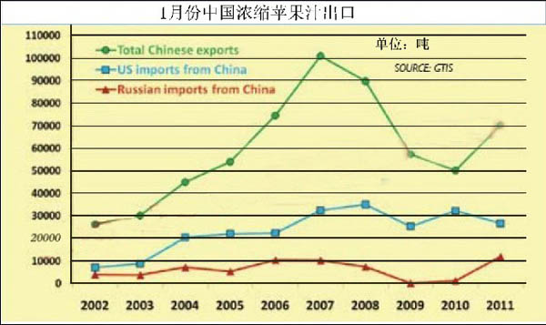 據(jù)最新發(fā)布的數(shù)據(jù)來看,2011年1月份,中國(guó)濃縮蘋果汁出口凸顯出了強(qiáng)勁的勢(shì)頭。這些數(shù)據(jù)不僅確鑿的表明了美國(guó)的購(gòu)買趨勢(shì),也反映出了俄羅斯市場(chǎng)的旺盛需求。